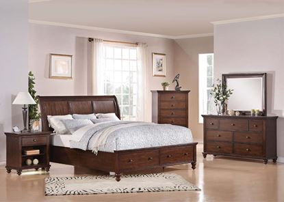 Handsome Transitional Design Fits Easily with Most Decors,Warm Cherry Finish,Quality Burnished Metal Drawer Pulls,Durable Construction of Solid Wood and Wood Veneers with Storage Drawers in Footboard and Gentle Sleigh Style Headboard.
