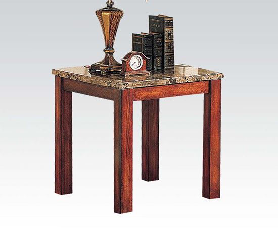 With brown f aux marble top and solid block legs, traditional and sleek Bologna Brown Marble Top End Table is an admirable accent. The Bologna Collection is a true work of art that makes a smart addition to the living room in your home.