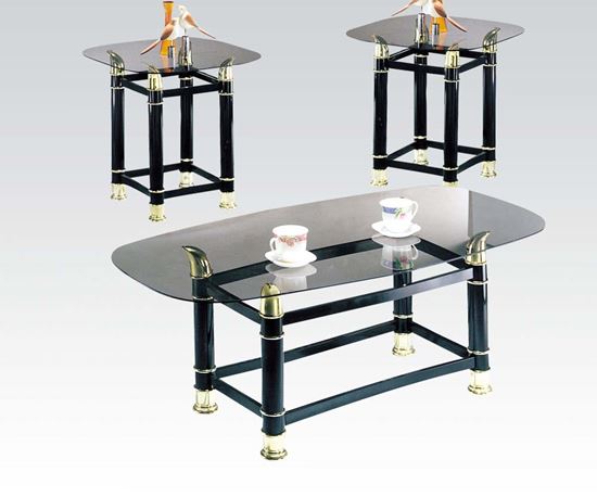 Bring a modern look into your living room with this Greenfield 3 PC Coffee and End Table Set with Smoky Glass Tops. The Greenfield Smoky Glass Collection comes with a contemporary black finished bases and smoky glass tops great for displaying candles, vases or decorative items.