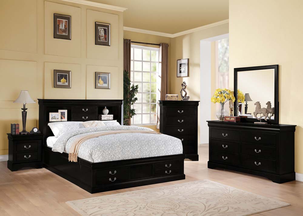 The Louis Philippe storage bedroom collection features storage headboard, hand selected veneers and brushed nickel hardware. This collection will complement your favorite bedroom style with 3 different color options for you to choose in white, black, and cherry.