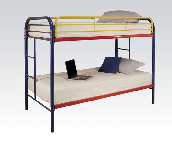 Stack up and save space with this Thomas Black Metal Twin over Twin Bunk Bed from Acme Furniture featuring a twin bed on top and a twin bed on bottom with attached double ladders for easy top access. Kids will love them and you'll enjoy the sturdiness and stability as well as the extra space.