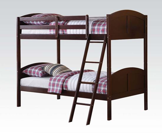 The space saving design of this Toshi Dark Cherry Twin over Twin Bunk Bed gives a stylish modern look crafted with beautiful solid wood. Designed with safety in mind, the bed includes guardrails and a sturdy integrated ladder. Function and elegance are combined to give this bed a striking appearance.