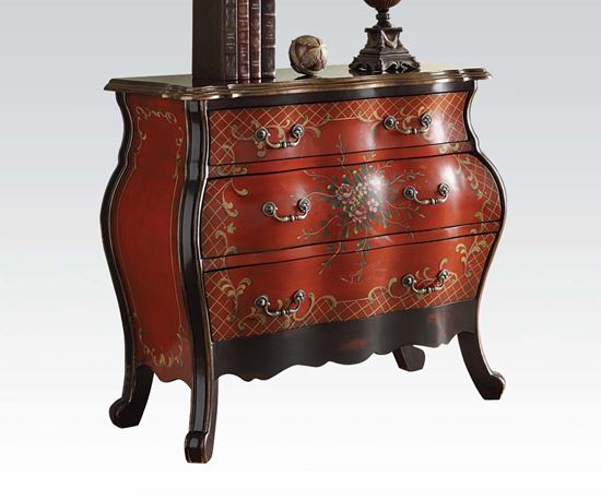 With functionality and fashion-forward design, this Iden Cherry Bombay Chest from furniture 90016 is sure to be a popular accent in your home. The Iden Bombay chest features cherry finish, three drawers and floral details.